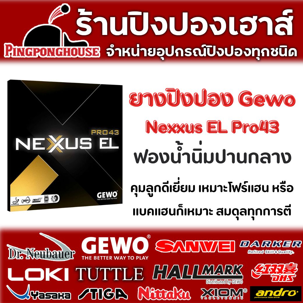 GEWO Nexus EL Pro 43 เป็นการรวมกันอย่างลงตัวของหน้ายางที่เกาะลูกด้วยเทคโนโลยี DDC40+ 2.0 และความแรงที่คุณต้องการสำหรับปิงปองสมัยใหม่ที่ใช้สปินในการบุก ยางมีความแรงและความยืดหยุ่นเป็นตัวกลางของซีรีย์ Nexxus EL Pro 43 และมีจุดแข็งในเรื่องของความโดดเด่นในการสร้างลูกหมุนและการบุก คุณสมบัติข้อดีของยางนี้คือ ขึ้นลูกได้ชัวร์และมีฟิวลิ่งที่ดีเพราะยางนี้ให้สัมผัสที่นุ่มในการบุกและในการตีแบบต่อเนื่อง ขอบคุณเทคโนโลยีหน้ายาง nexxTT ที่ช่วยทำให้ลูกหมุนได้มากไม่ว่าจะเป็นในเรื่องของการเสริฟหรือการรีเทิร์นลูก