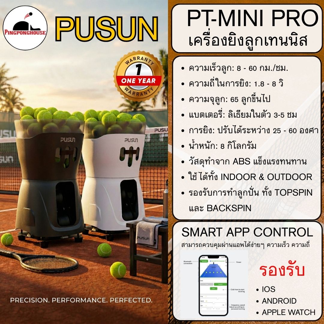 เครื่องยิงลูกเทนนิส Pusun PT-Mini Pro เครื่องยิงเทนนิสอัจฉริยะ รุ่นพกพาสะดวกที่สุด รับประกัน 1 ปี I ร้านปิงปองเฮาส์